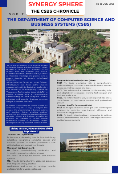 We invite all aspiring students to join our innovative program in Computer Science and Business Systems, where they will gain a unique blend of technical and business skills essential for modern careers. Our dedicated faculty actively engages students in their educational journey, providing personalized support and fostering growth. Through a variety of interdisciplinary activities and practical experiences, we equip students with the competencies needed for professional success and adaptability. Being part of the CSBS community at SGBIT not only enhances your academic and professional journey but also creates cherished, lifelong memories
